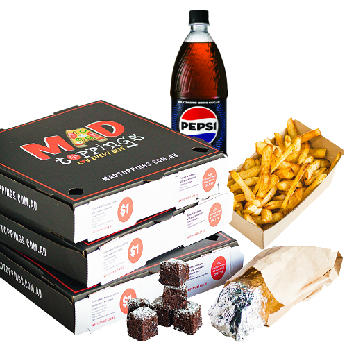 Family Bundle Deal$68.95Any 3 Large Pizza, Garlic bread, Chips, Brownie, and 1.25L Drink