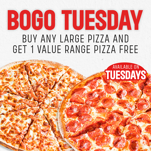 BOGO TuesdayBuy any large pizza and get 1 Value Range Pizza FREE