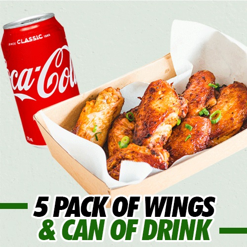 5 Pack of Wings, Can of Drink$11.95