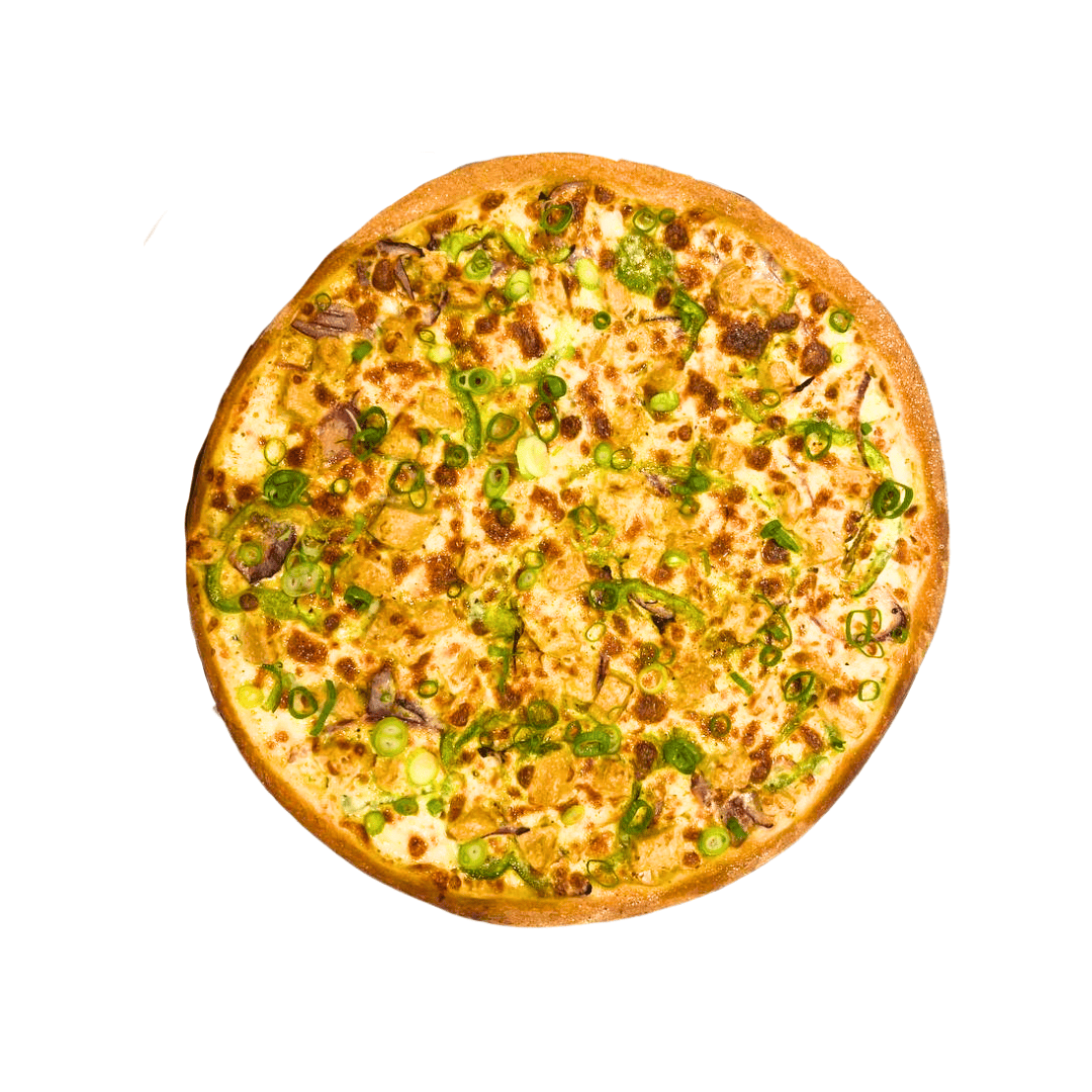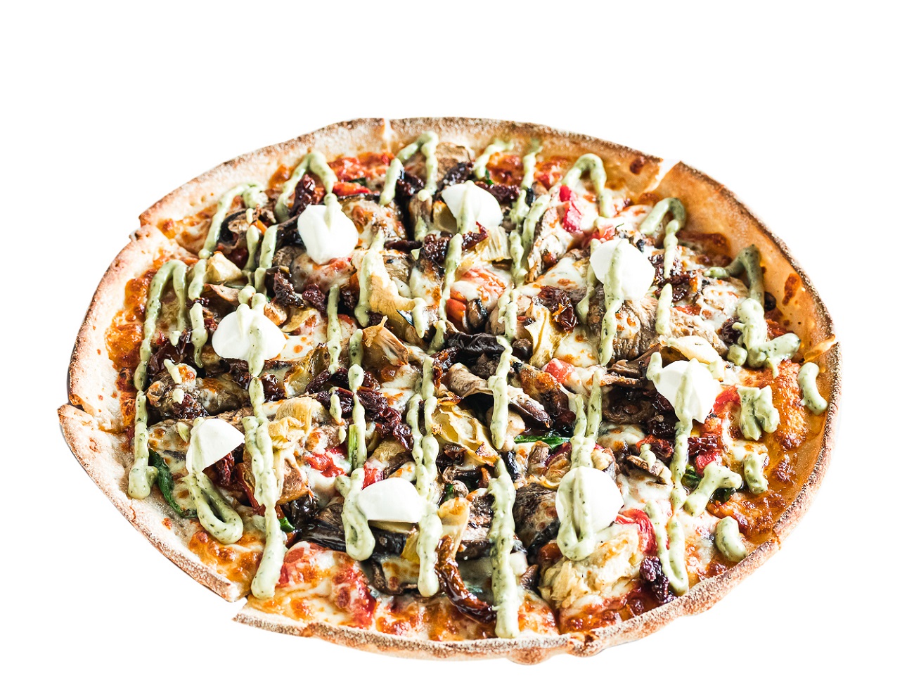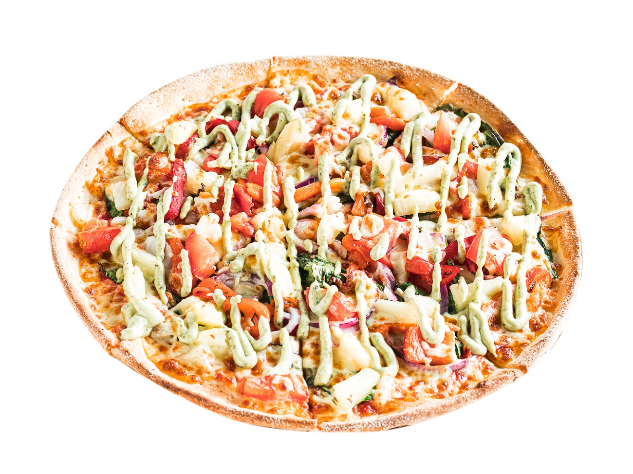Tomato and herb base, spinach onion, tomato, mushrooms, fire roasted capsicum, pineapple and cheese topped with mad pesto sauceChoose one