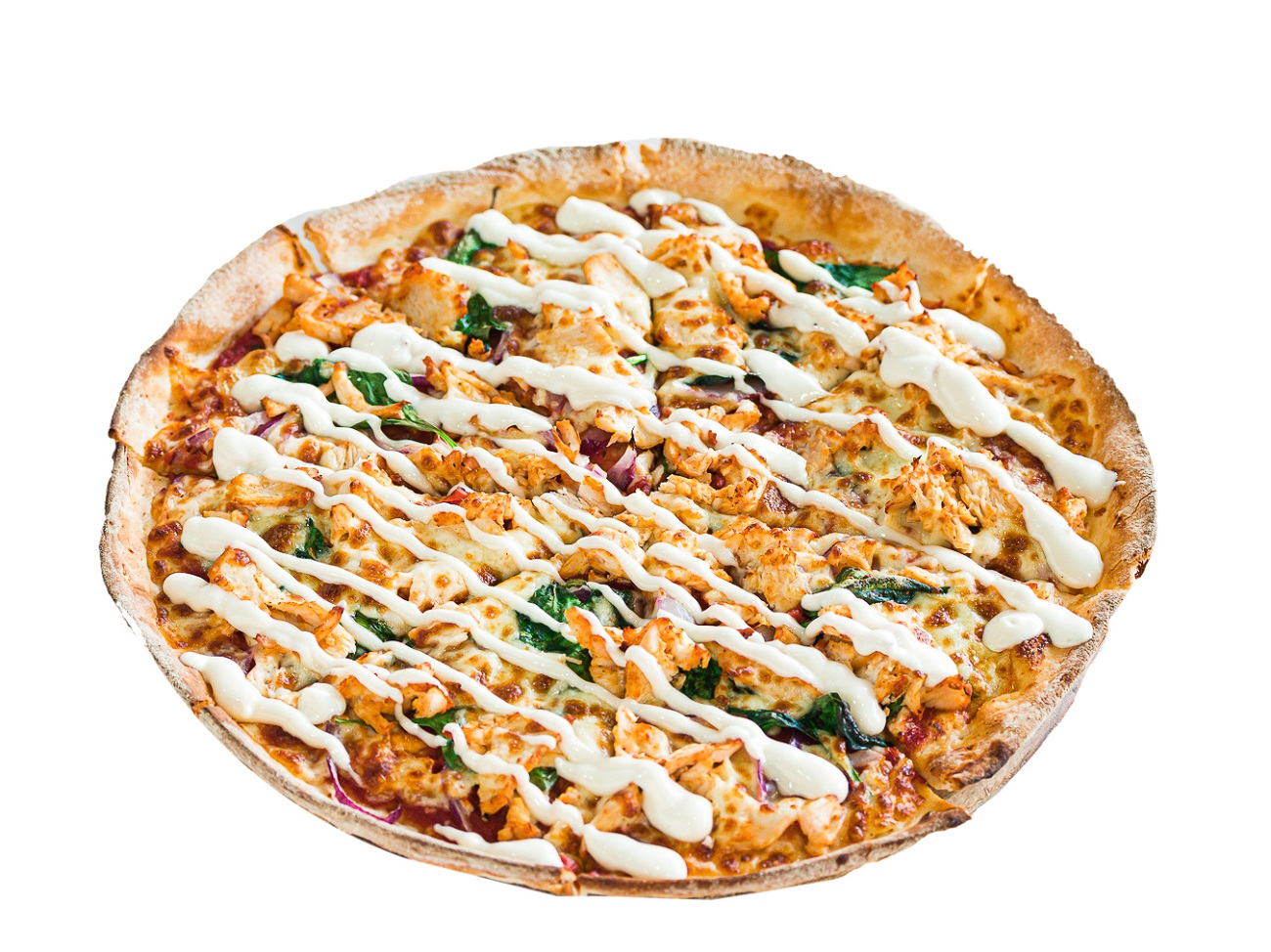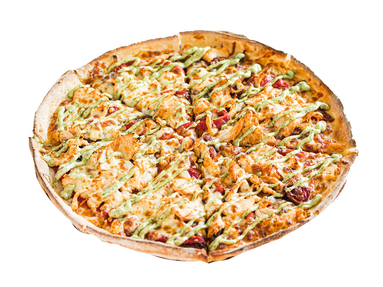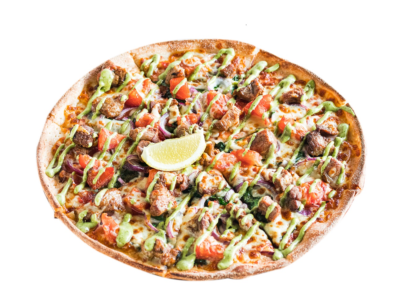Tomato and herb base, spinach onion, tomato, mushrooms, fire roasted capsicum, pineapple and cheese topped with mad pesto sauceChoose one