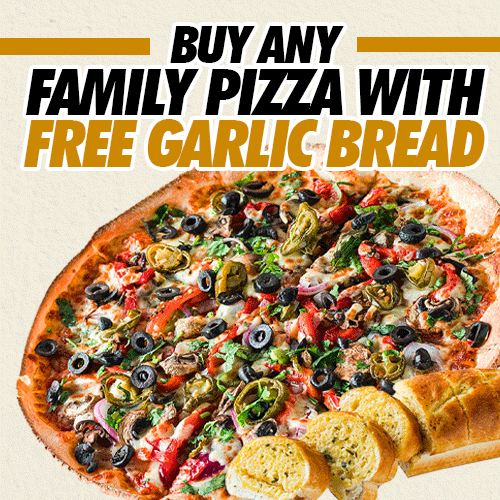 Family Bundle Deal$68.95Any 3 Large Pizza, Garlic Bread, Chips, Brownie, And 1.25L Drink