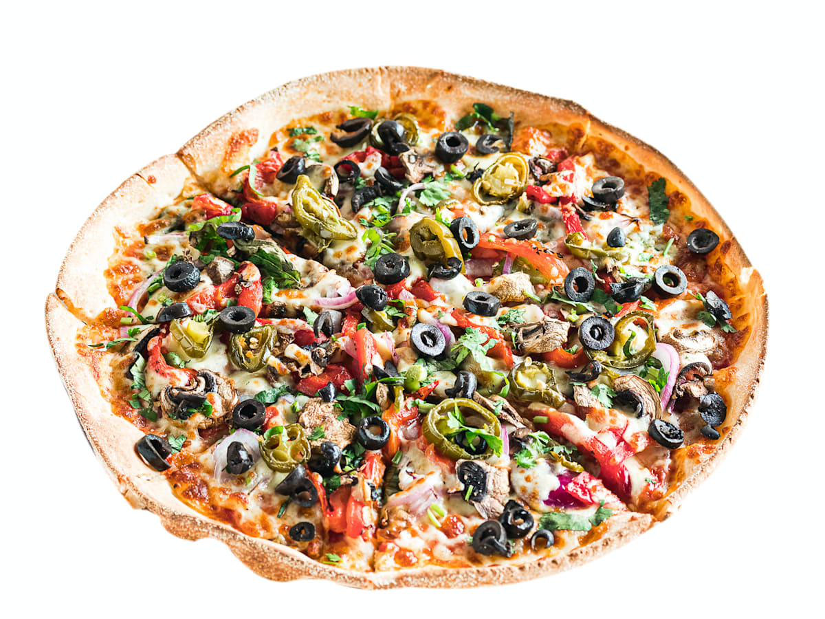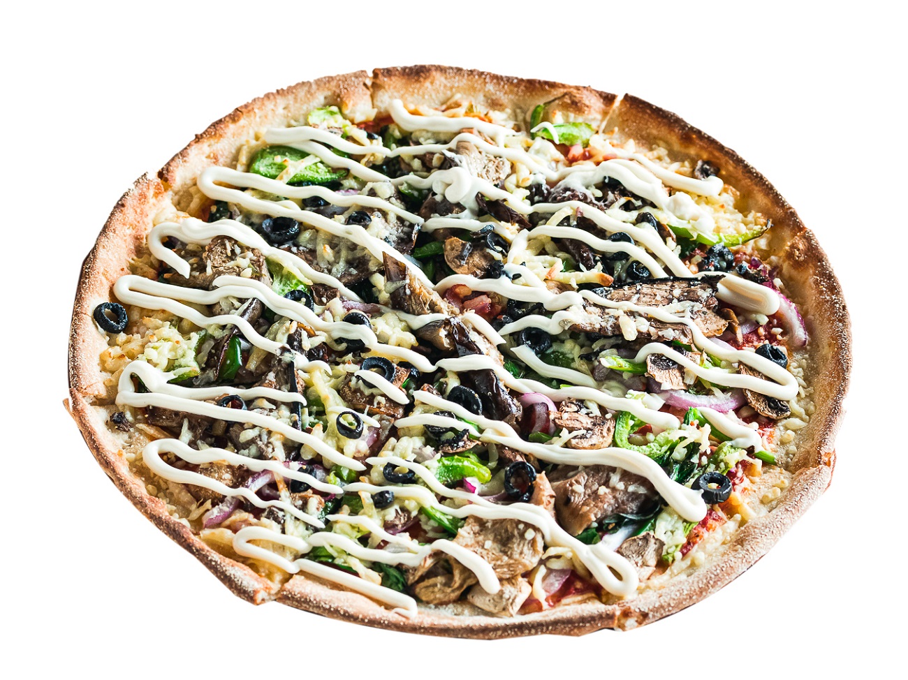 Tomato & herb base, spinach, mushroom, spanish onion, capsicum, eggplant, olives, and vegan cheeseChoose one