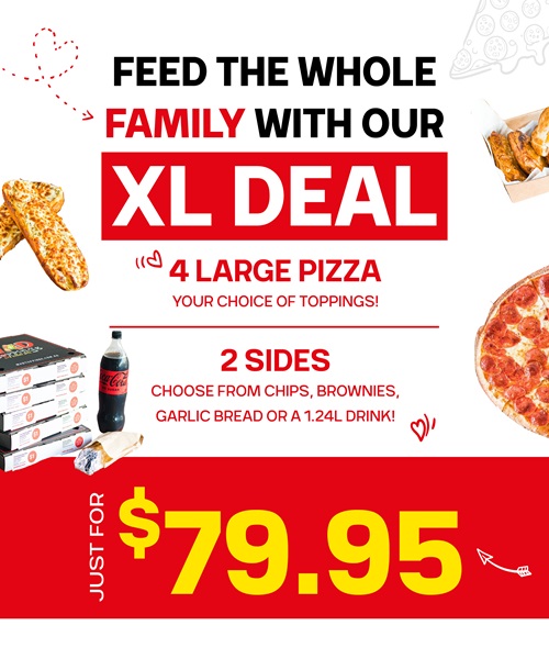 NEW!$79.95Family XL DealAny 4 large pizzas + 2 sides (choice of chips, brownies, garlic bread, or a 1.25L drink)