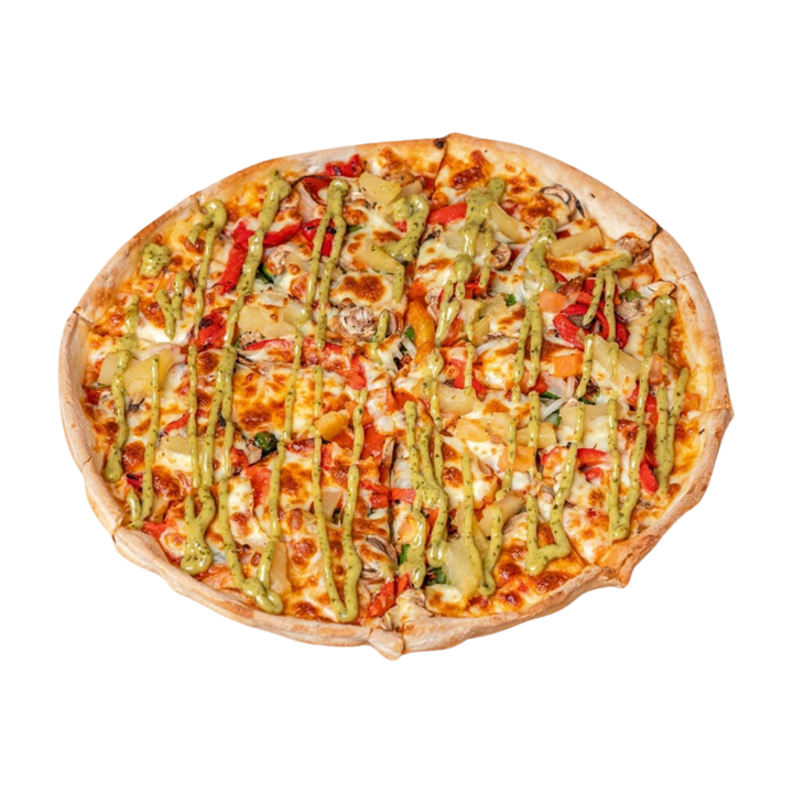 Addictive flavour! Mad tomato sauce, garlic sauce, marinated chicken, fire-roasted capsicum, caramelized onion, and mozzarella cheese topped with mad pesto sauce.