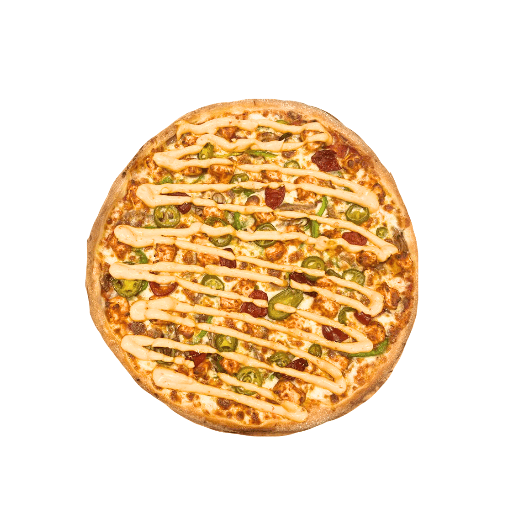 Tomato & herb base, chicken, onions, cheese, roasted capsicum, mushrooms topped with spring onions and Mad Signature Sweet Chilli Mayo Sauce.Choose one