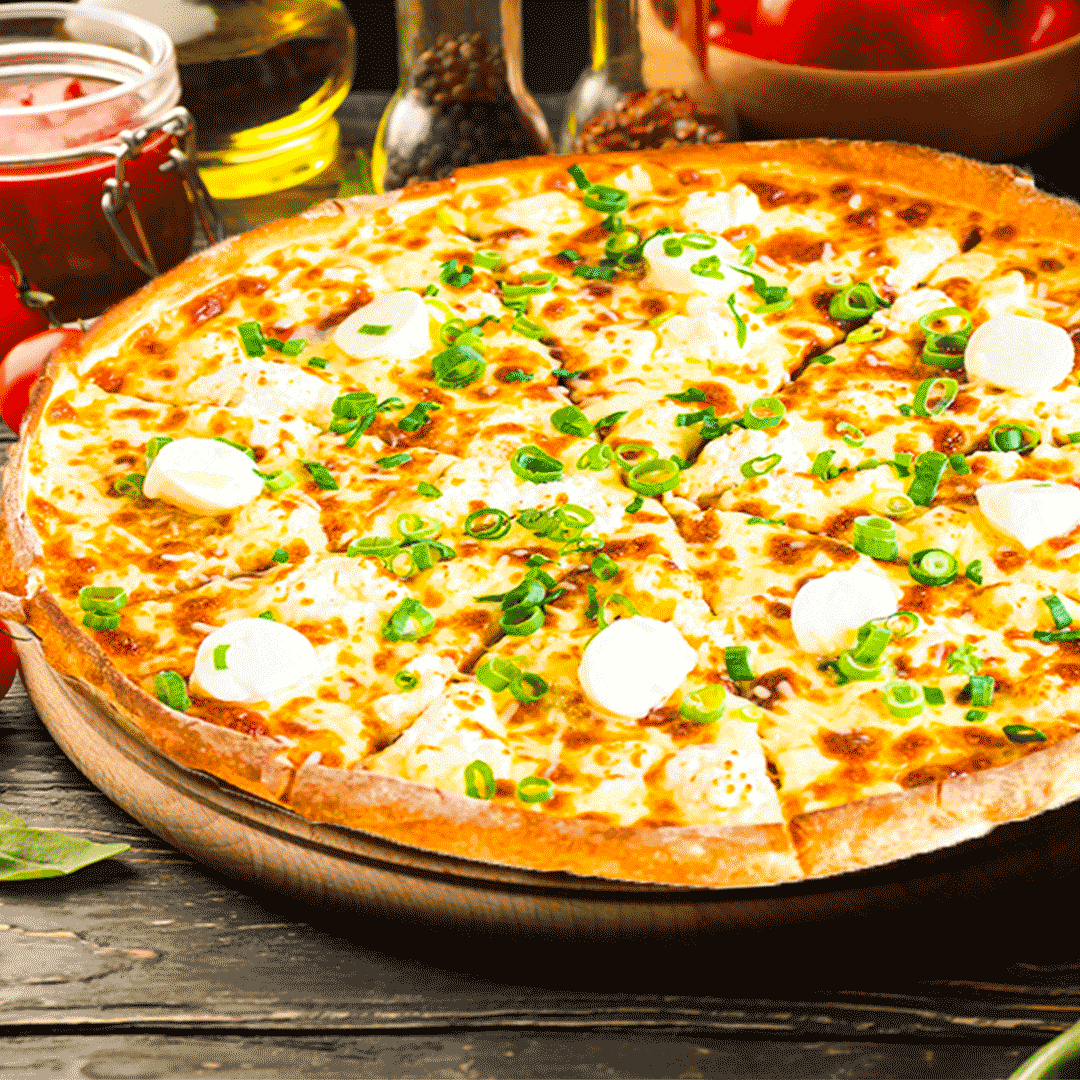 Mad crème sauce, butter chicken, red chili pepper, caramelized onion, and mozzarella cheese topped with spring onions.