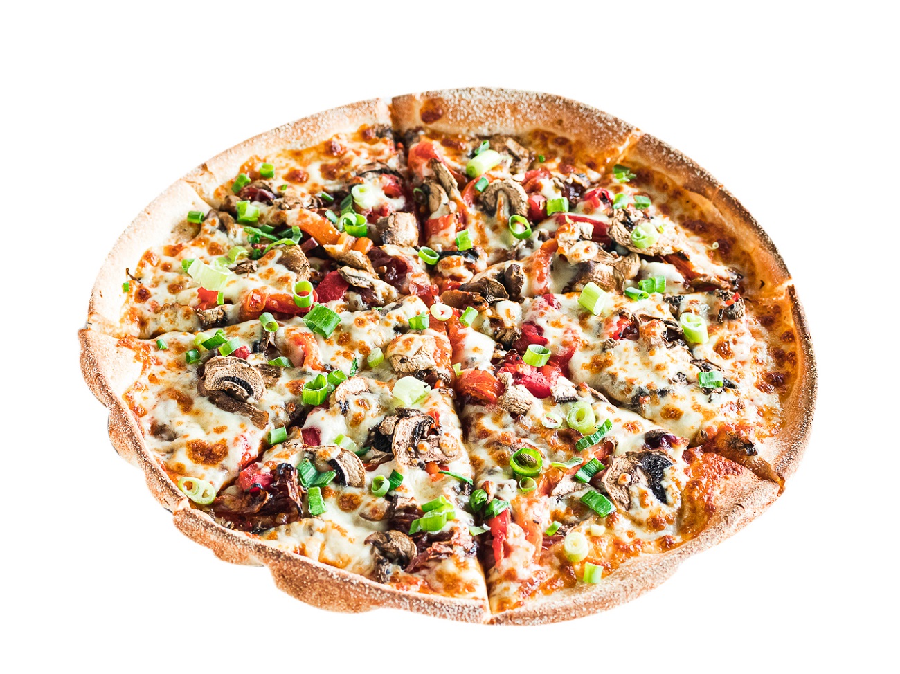 Tomato and Herb Sauce, Caramalised Onions, Fire Roasted Capsicum, Mushrooms, Chilli Flakes and Cheese