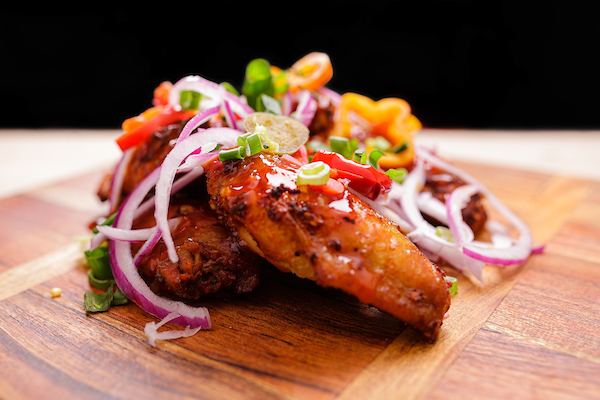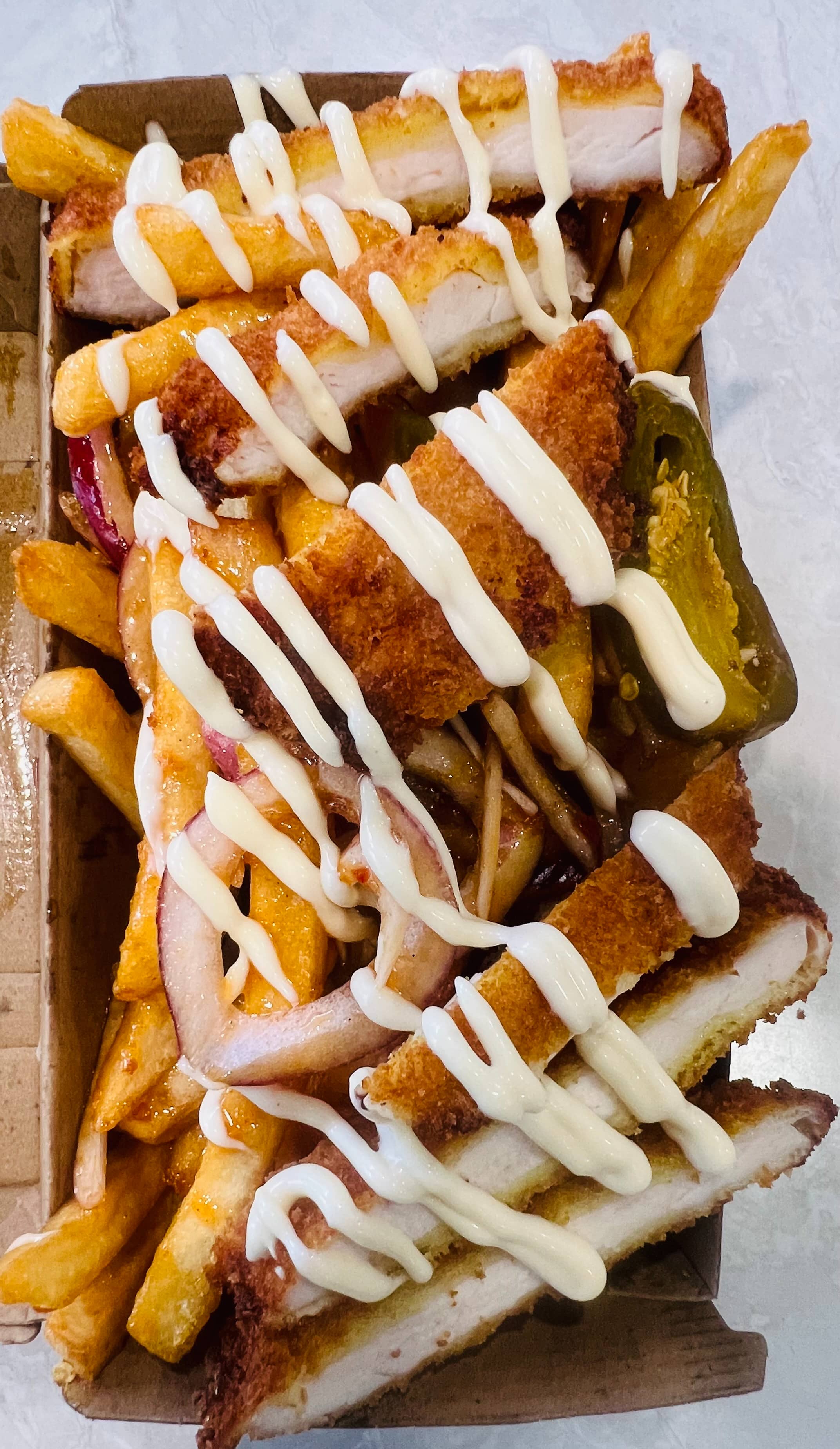 Chilli Sauce, Marinated Chicken, Onion, Capsicum Jalapenos, Cheese topped with Spring Onions and MAD Signature Spicy Mint Mayo Sauce