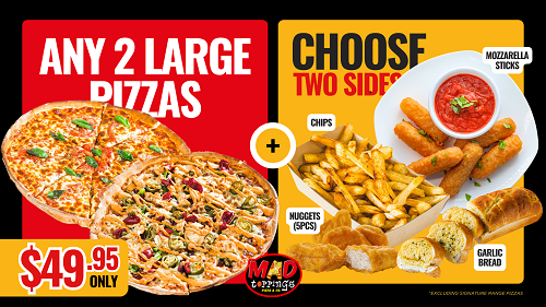 Any 2 LRG MAD Pizza + GB + 1.25L$46.95
