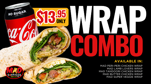 Wrap Combo$14.95peri peri chicken wrap, lamb lovers wrap, tandoori chicken wrap, butter chicken wrap, & super veggie wrap