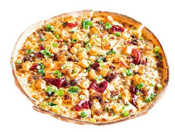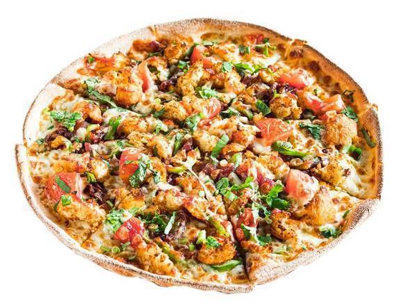 Mad crème sauce, butter chicken, red chili pepper, caramelized onion, and mozzarella cheese topped with spring onions.
