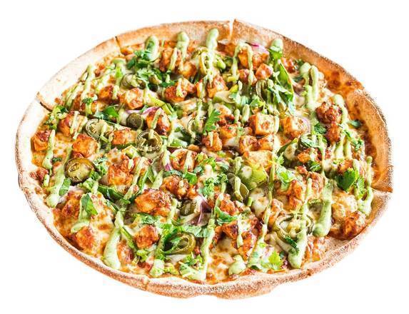 Chilli Base, Marinated Chicken Breast, Spanish Onions, Capsicum, Shallots, Mozzarella Topped With Sriracha Sauce N Coleslaw