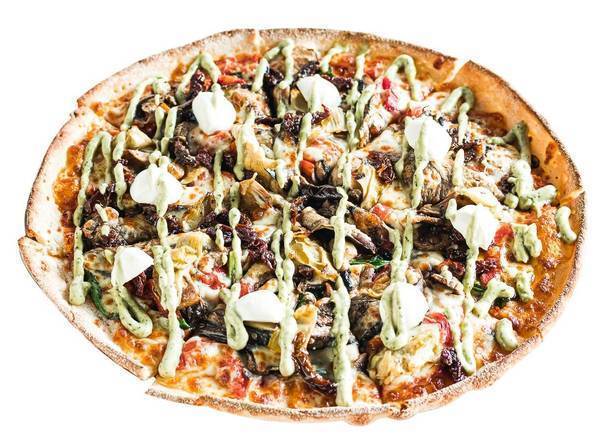 Tomato Herb Sauce, Garlic, Marinated Chicken, Caramelised Onion, Fire Roasted Capsicum And Cheese Topped With Mad Pesto Sauce