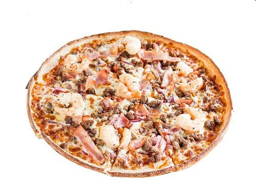 Tomato herb sauce, garlic, onion, ground beef, prawns and mozzarella cheese & bacon