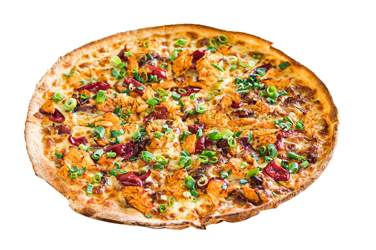 Chilli base, marinated chicken breast, Spanish onions, capsicum, shallots, mozzarella topped with sriracha sauce n coleslawChoose one