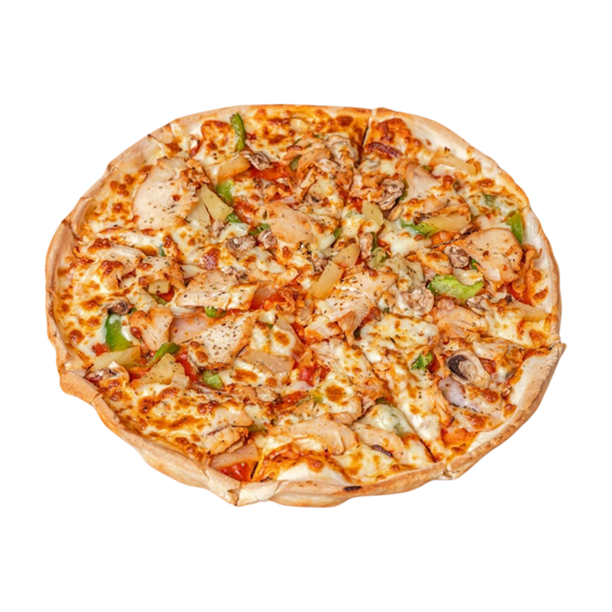 Tomato Sauce, Garlic, caramelized Onion, Roasted Capsicum, marinated Chicken, Mozzarella.